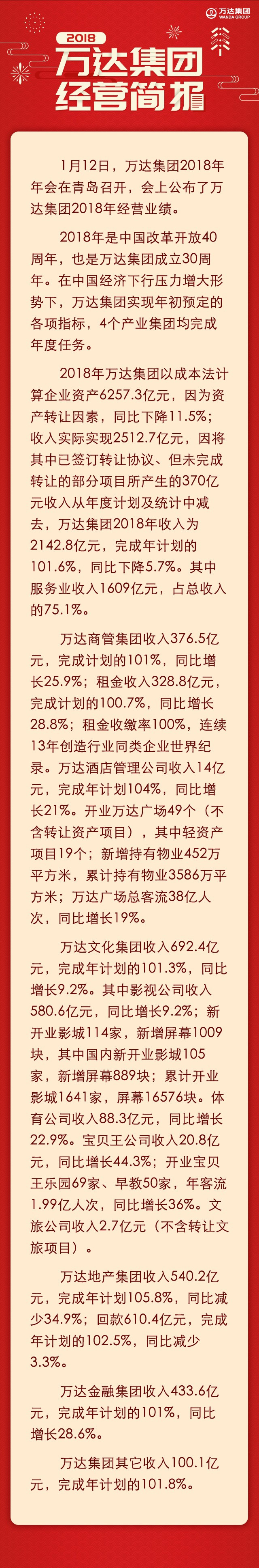 2018年是中國改革開放40周年,也是萬達集團成立30周年。在中國經(jīng)濟下行壓力增大形勢下,萬達集團實現(xiàn)年初預(yù)定的各項指標(biāo),4個產(chǎn)業(yè)集團均完成年度任務(wù)。