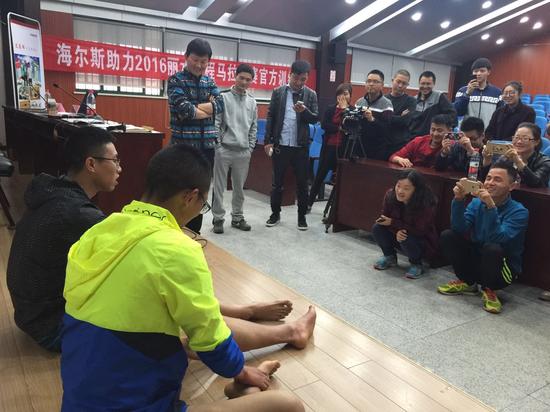 課上,方慶從穿戴裝備、跑前熱身、跑步姿勢、呼吸飲水等方面細(xì)致講解,帶領(lǐng)跑友進行跑前、跑后專業(yè)、規(guī)范的熱身和拉身,著重向大家介紹跑前熱身和賽后拉伸的重要性。同時,周裕民結(jié)合麗馬路線,介紹了如何進行賽前準(zhǔn)備、核心力量訓(xùn)練等內(nèi)容。