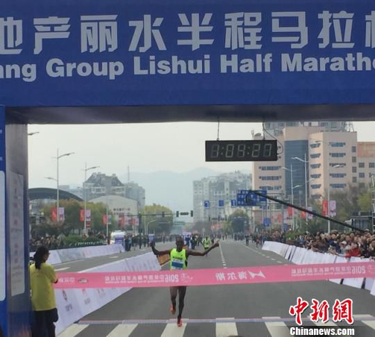 2016浙江麗水半程馬拉松開跑,來自坦桑尼亞的男選手率先沖過終點 李婷婷 攝